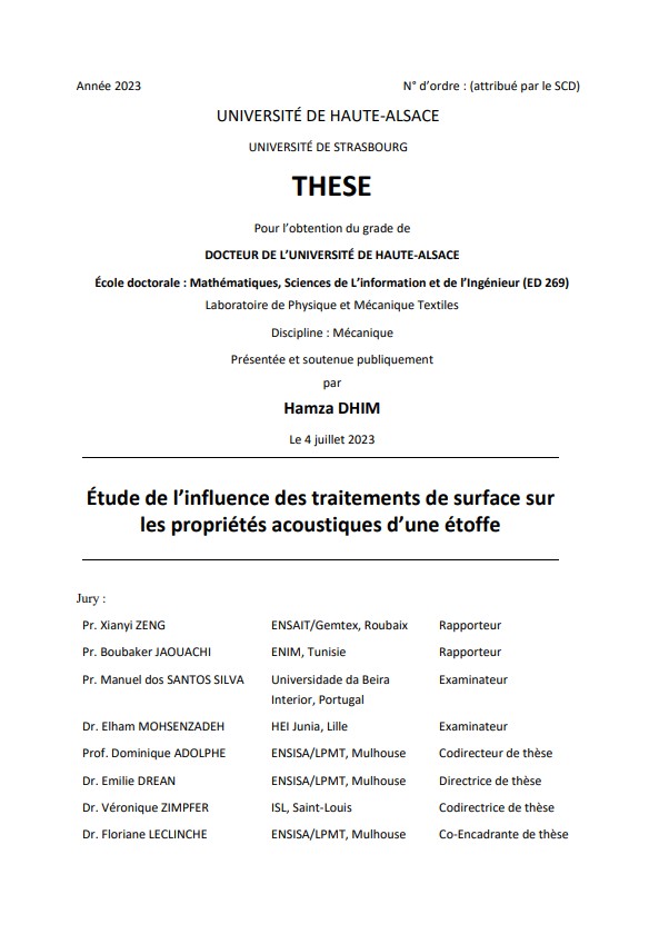 Son travail de thèse  est intitulé : Étude de l’influence des traitements de surface sur les propriétés acoustiques d’une étoffe.